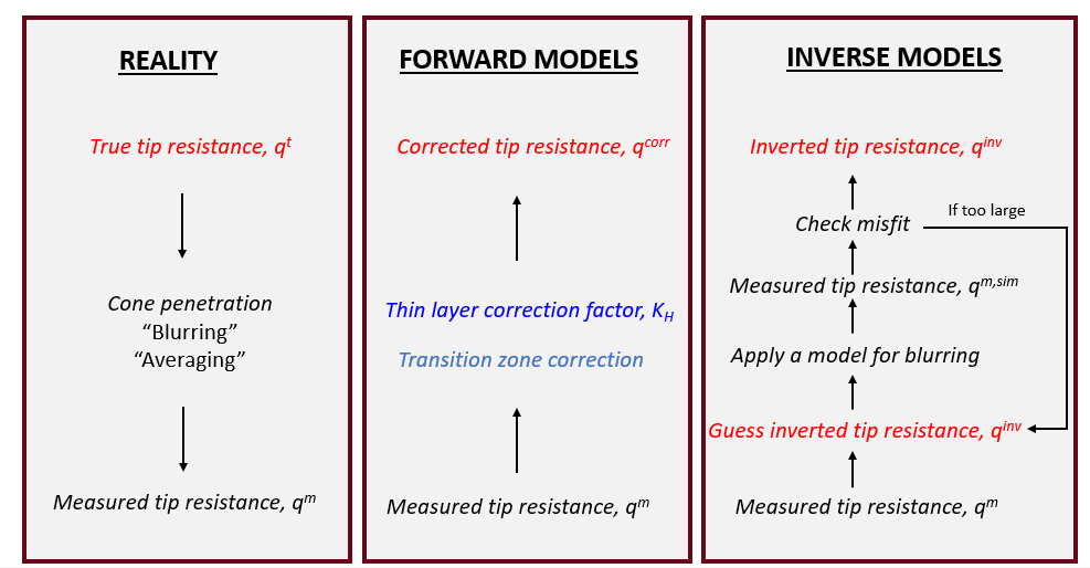 Motivated by the findings discussed in Yost et al. (2021), and in collaboration with the computational math group at Virginia Tech, Kaleigh is working to develop new and more effective multiple thin layer correction procedures. In Cooper et al. (2022), a new inverse method is proposed to determine true tip resistance. Inspired by the inverse method proposed by Boulanger and DeJong (2018), this method poses the inverse problem in a new way, assuming that the true tip resistance profile is a piecewise constant function with depth (i.e., only two degrees of freedom: layer location and layer tip resistance). This reduces the computational cost of the analysis. Results indicate that the Cooper et al. (2022) method is able to better identify thin interbedded soil layers in calibration chamber data compared to existing procedures. Matlab scripts to perform the Cooper et al. (2022) procedure are available on GitHub.