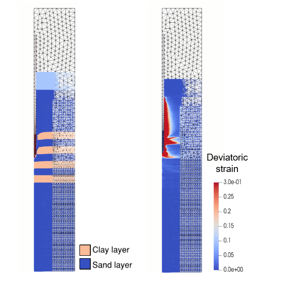 To complement the few available pairs of qm and qt data required to develop and validate multiple thin layer correction procedures, Kaleigh is developing a database of numerical CPT data using the Material Point Method (MPM). MPM is a continuum-based numerical method in which the domain is discretized into a set of “material points” that are free to move through a background computational mesh. In this way, MPM is particularly suited to large deformation problems, like cone penetration. I developed a numerical model of CPT in layered soils using the Anura3D MPM code.